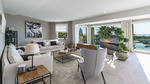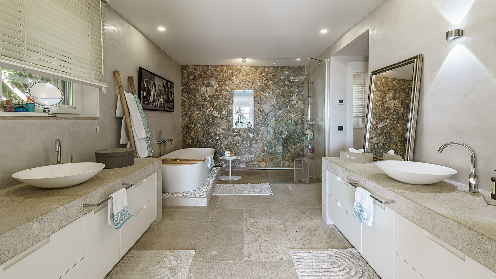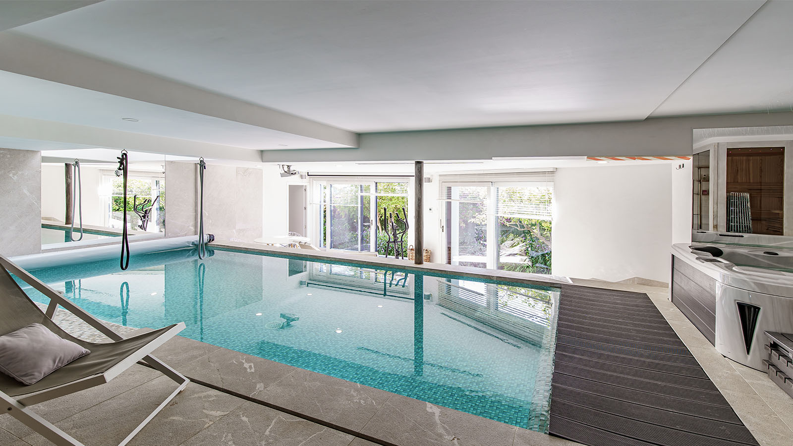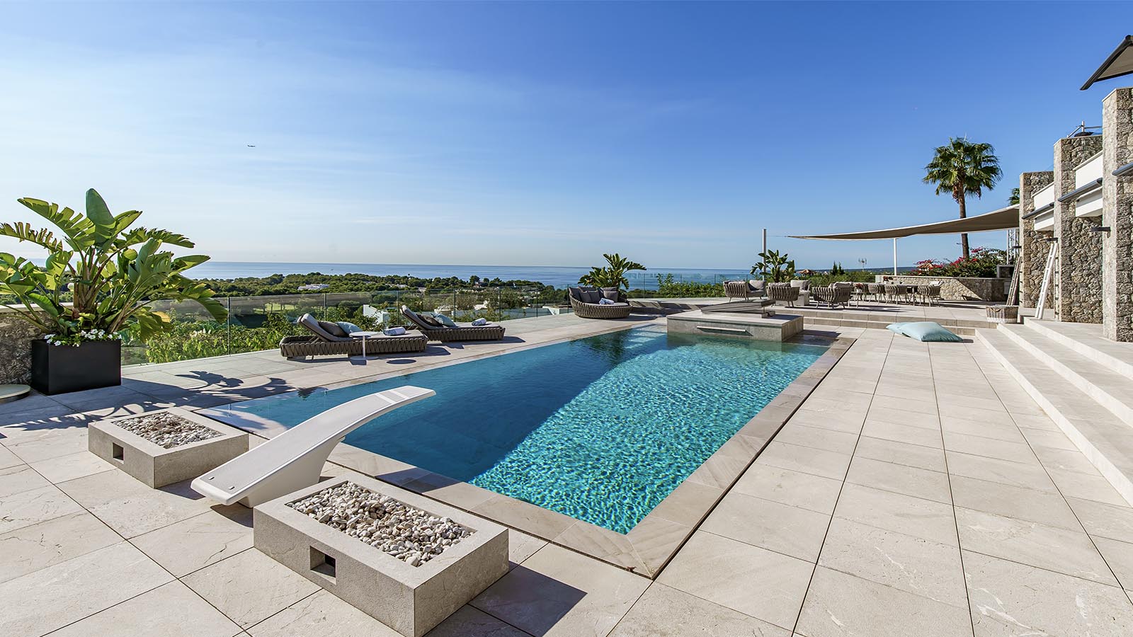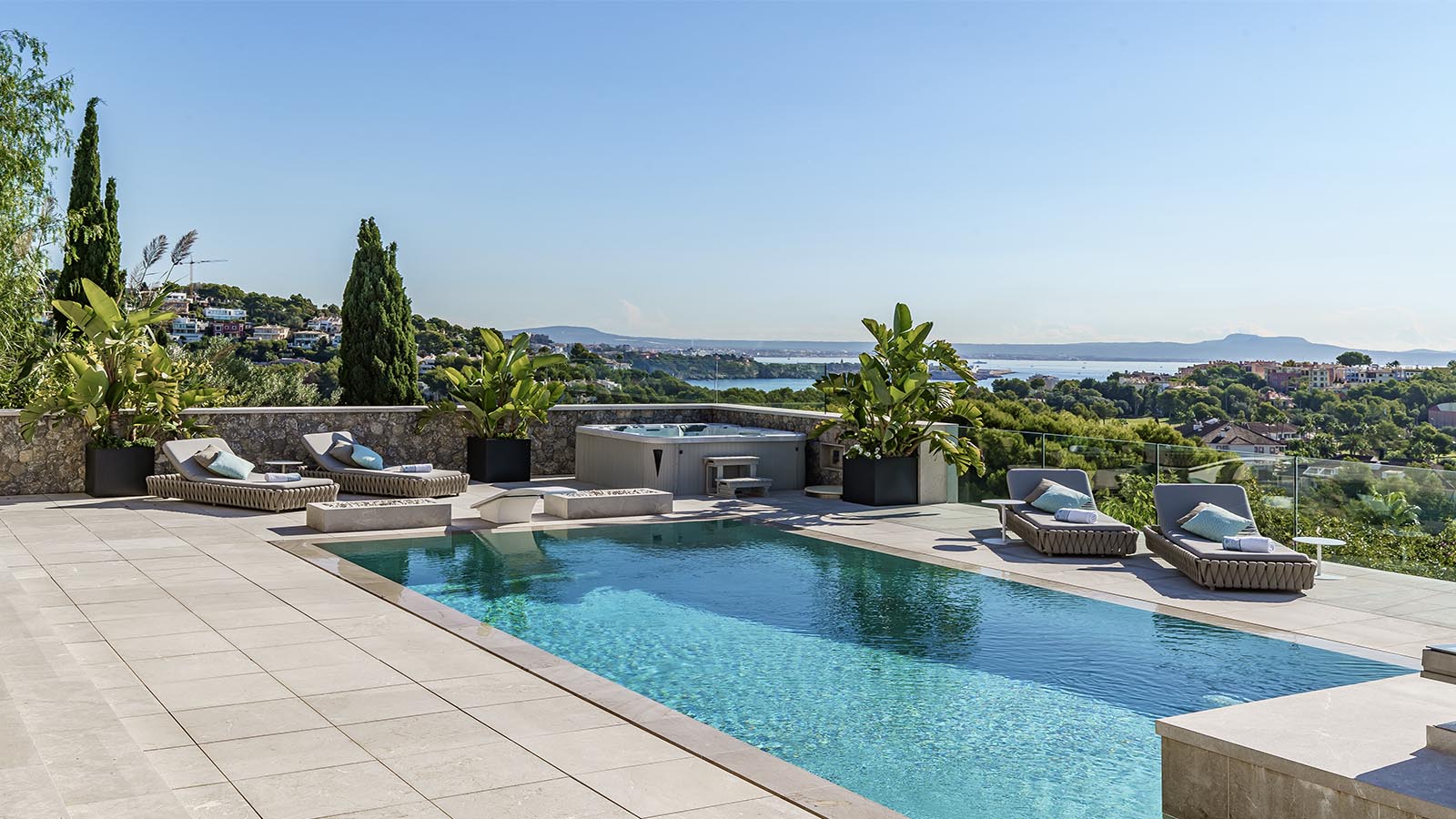 Located in the prestigious Anchorage Hill in Bendinat, this luxurious villa offers breathtaking sea views, timeless elegance, and the highest level of comfort across three spacious levels. The bright and airy entrance leads into an open-plan living and dining area with a cozy fireplace, seamlessly connected to a fully equipped kitchen with an integrated dining space. Large glass doors open to a covered terrace with a premium outdoor kitchen, BBQ area, lounge with fire pit, and a generous pool terrace featuring a Jacuzzi – the perfect setting for relaxing or entertaining under the Mediterranean sun. The ground floor also includes a versatile office or guest bedroom, a full bathroom, guest WC, and utility room. Upstairs, the master suite impresses with its own fireplace, walk-in wardrobe, and luxurious en suite bathroom. Three additional bedrooms, all with terrace access, and two modern bathrooms provide ample space for family and guests. The lower level is a true wellness haven, complete with an indoor pool, Jacuzzi, sauna, fitness area, bathroom, and an additional bedroom for guests or staff. Equipped with underfloor heating, integrated air conditioning, a photovoltaic system, KNX smart home technology, alarm system, double garage and outdoor parking, this exceptional property combines modern luxury with Mediterranean charm – a rare gem in one of Mallorca’s most sought-after locations.