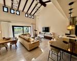 Built in 2017, this stylish 127m² villa showcases a contemporary design and high-quality finishes throughout. The open-plan living area is bright and inviting, featuring a vaulted beamed ceiling and large sliding glass doors that flood the space with natural light. The dining area connects seamlessly to a sleek, modern fitted kitchen with a breakfast bar and separate utility room.