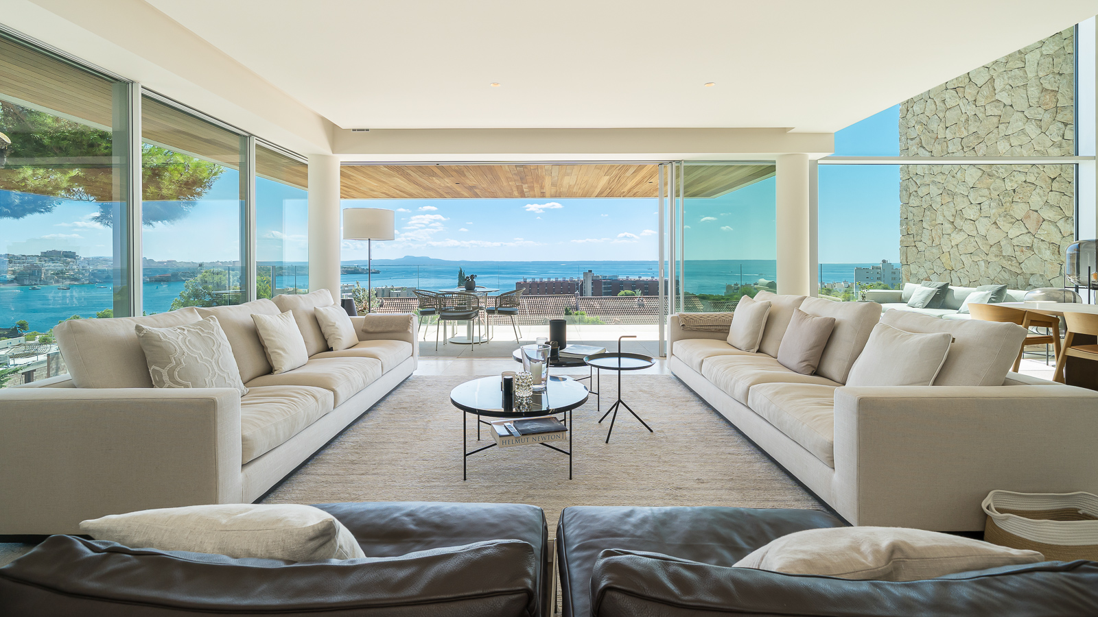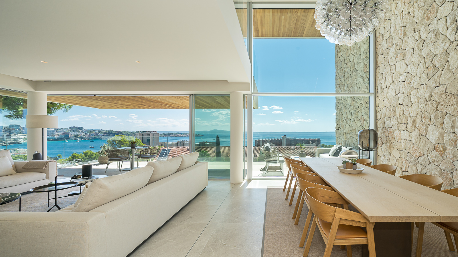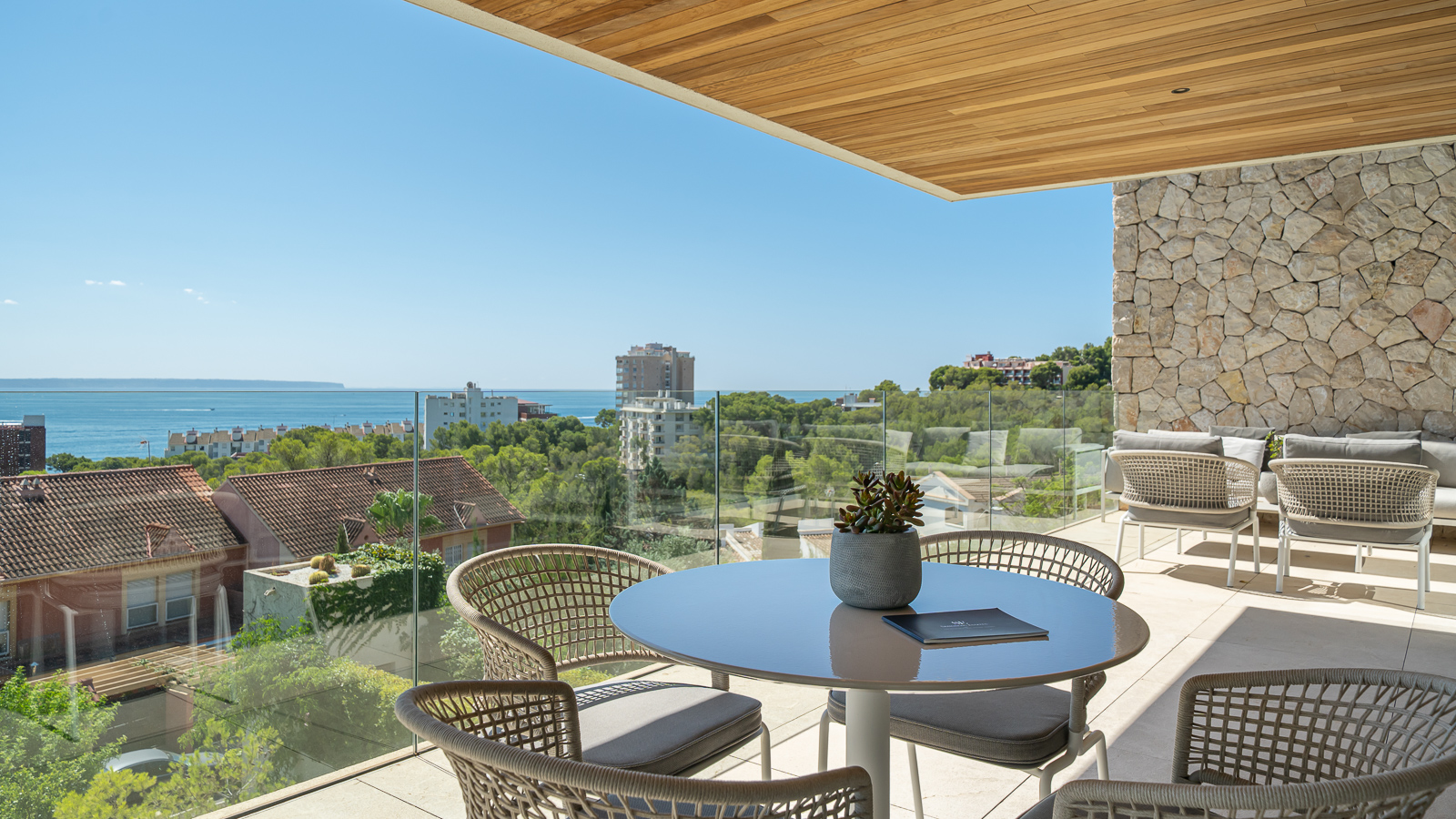 A private elevator leads directly into the living area with a high-end designer kitchen, open floor plan, and a distinctive Mallorcan stone wall. Four bedrooms — three with en-suite bathrooms — are complemented by an additional bathroom and an elegant guest WC.