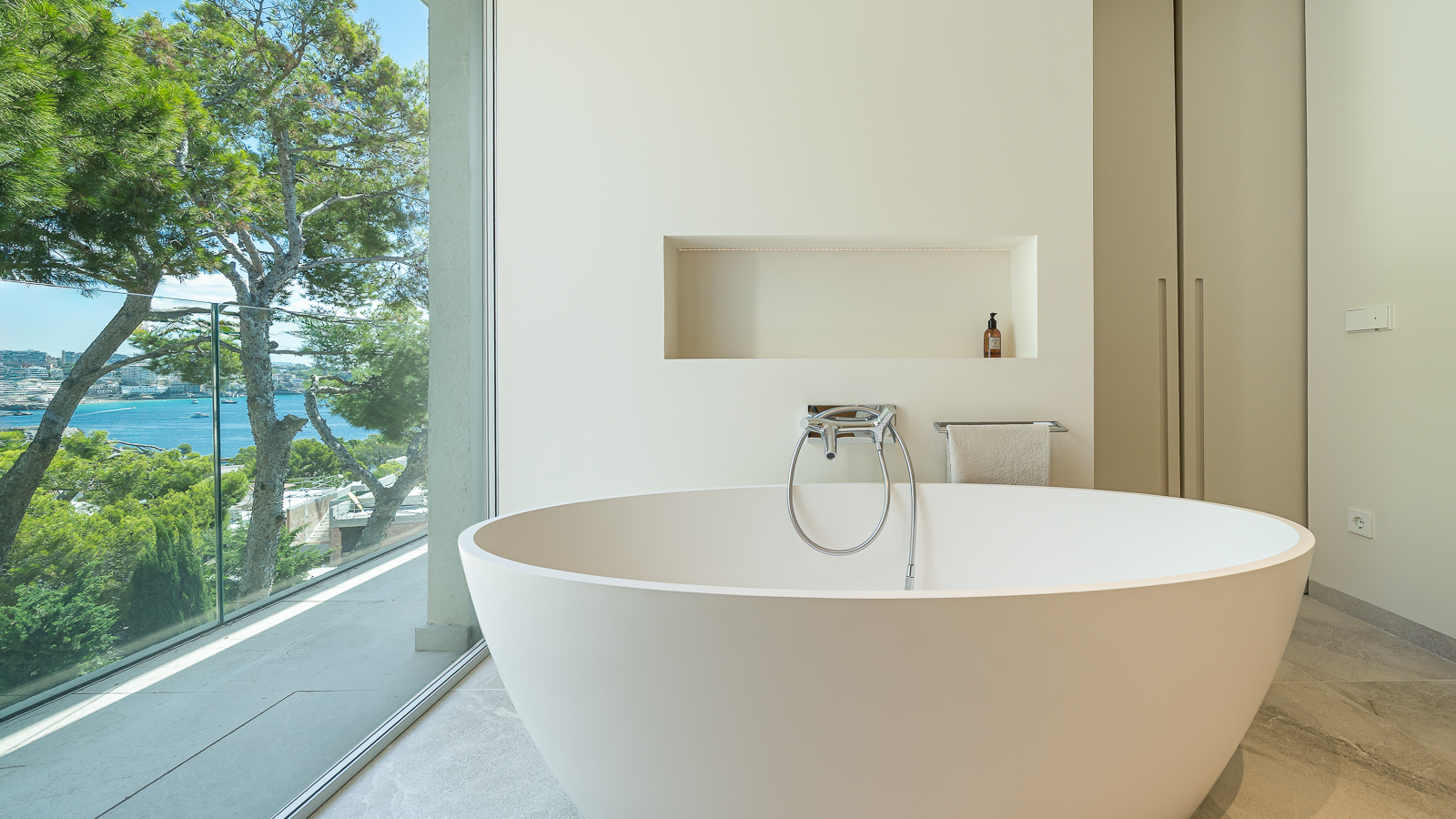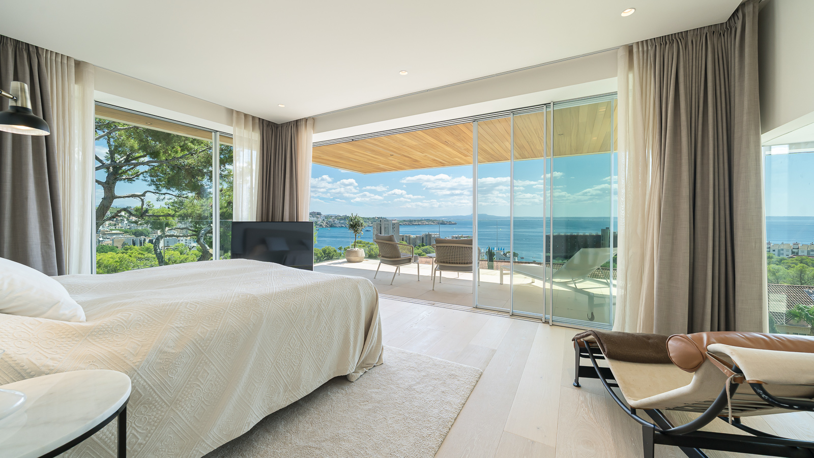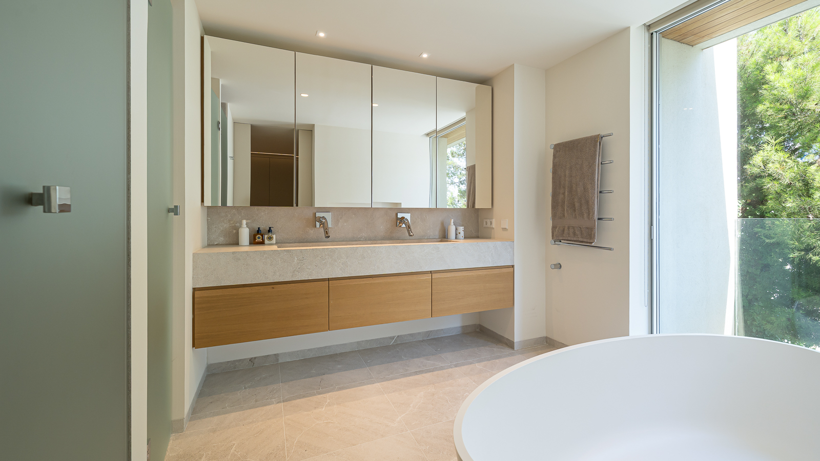 A private elevator leads directly into the living area with a high-end designer kitchen, open floor plan, and a distinctive Mallorcan stone wall. Four bedrooms — three with en-suite bathrooms — are complemented by an additional bathroom and an elegant guest WC.