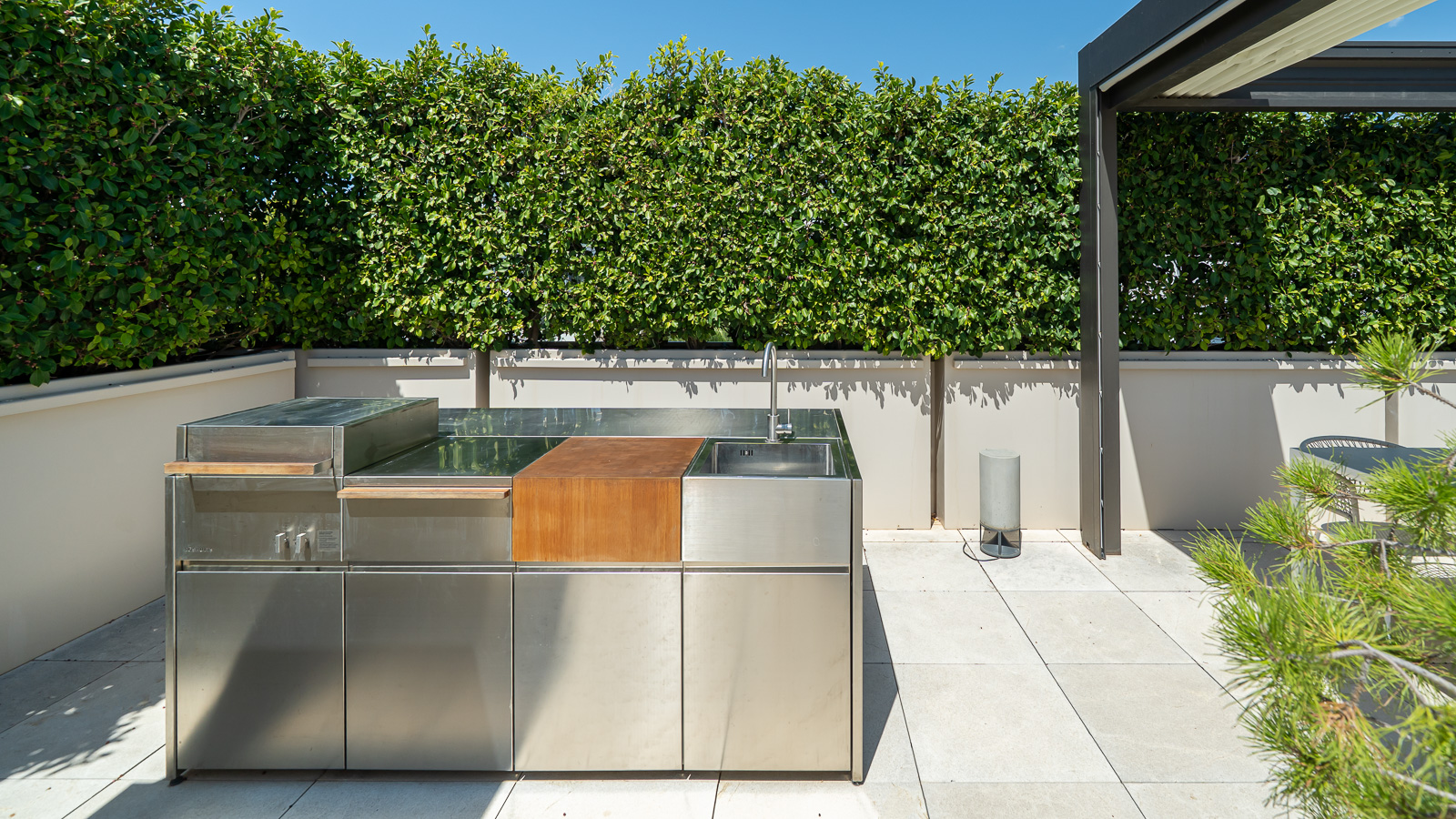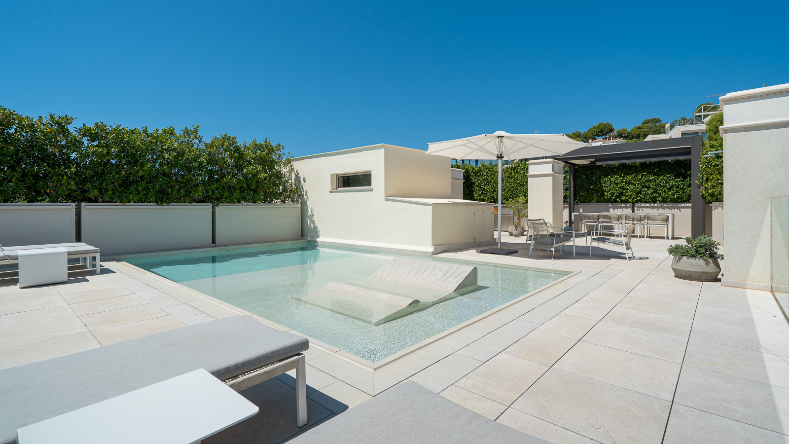 The spectacular rooftop terrace features a private pool, stylish outdoor kitchen, and luxurious chill-out area, offering unparalleled panoramic sea views — a place of tranquility and exclusivity.