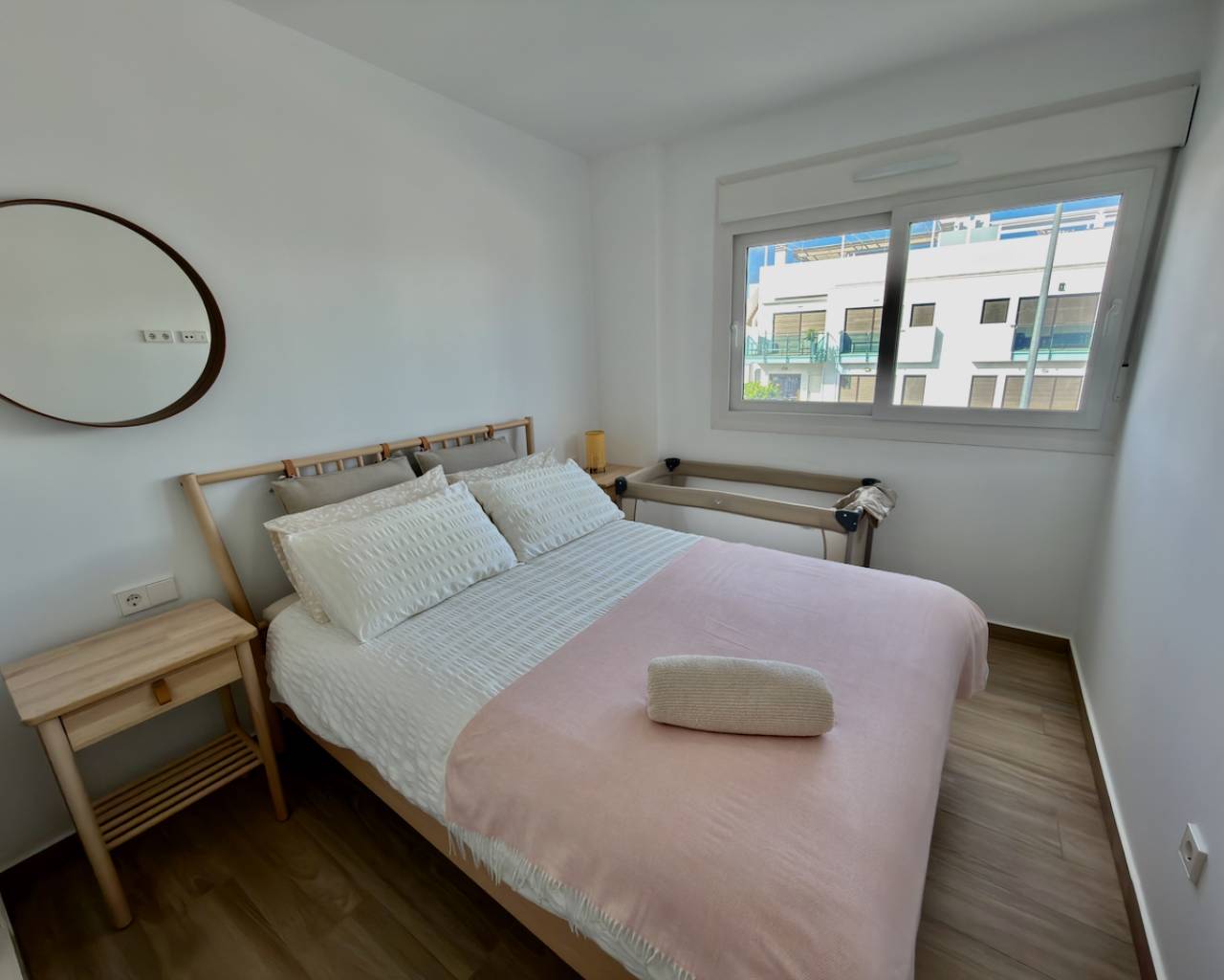 The apartment is equipped with a fully fitted kitchen, built-in wardrobes in all bedrooms, and is furnished to a high standard with furniture negotiable. Enjoy the outdoor lifestyle with a private terrace and a large solarium, perfect for relaxing or entertaining while taking in lovely views of the surrounding communal gardens and urbanisation.