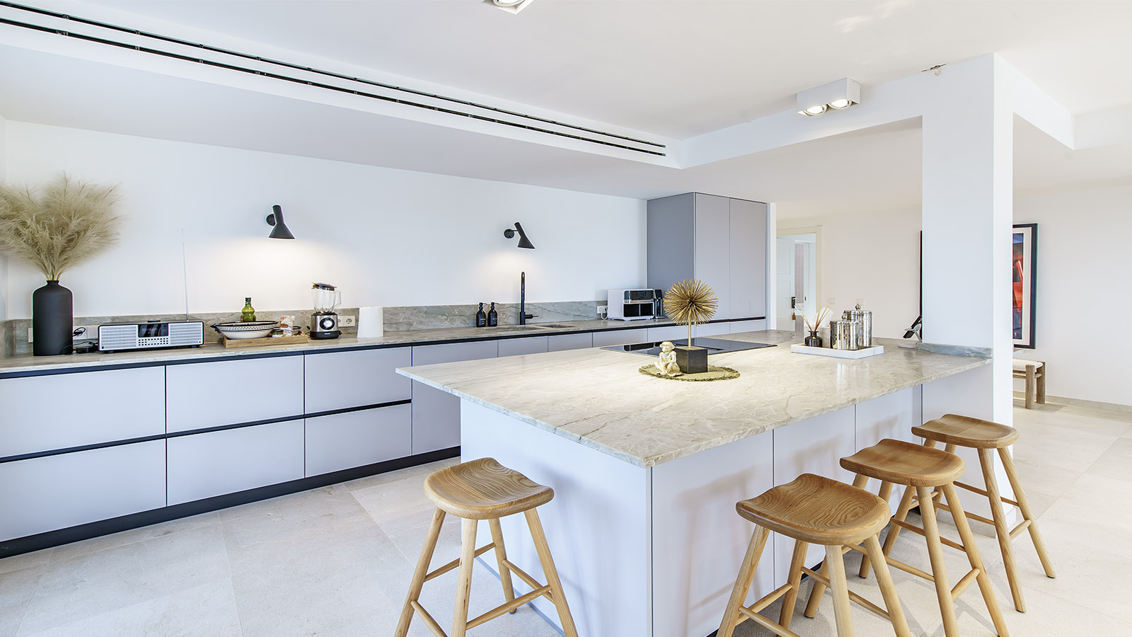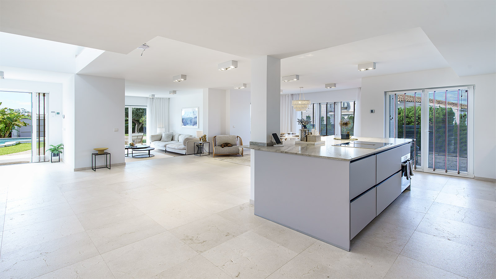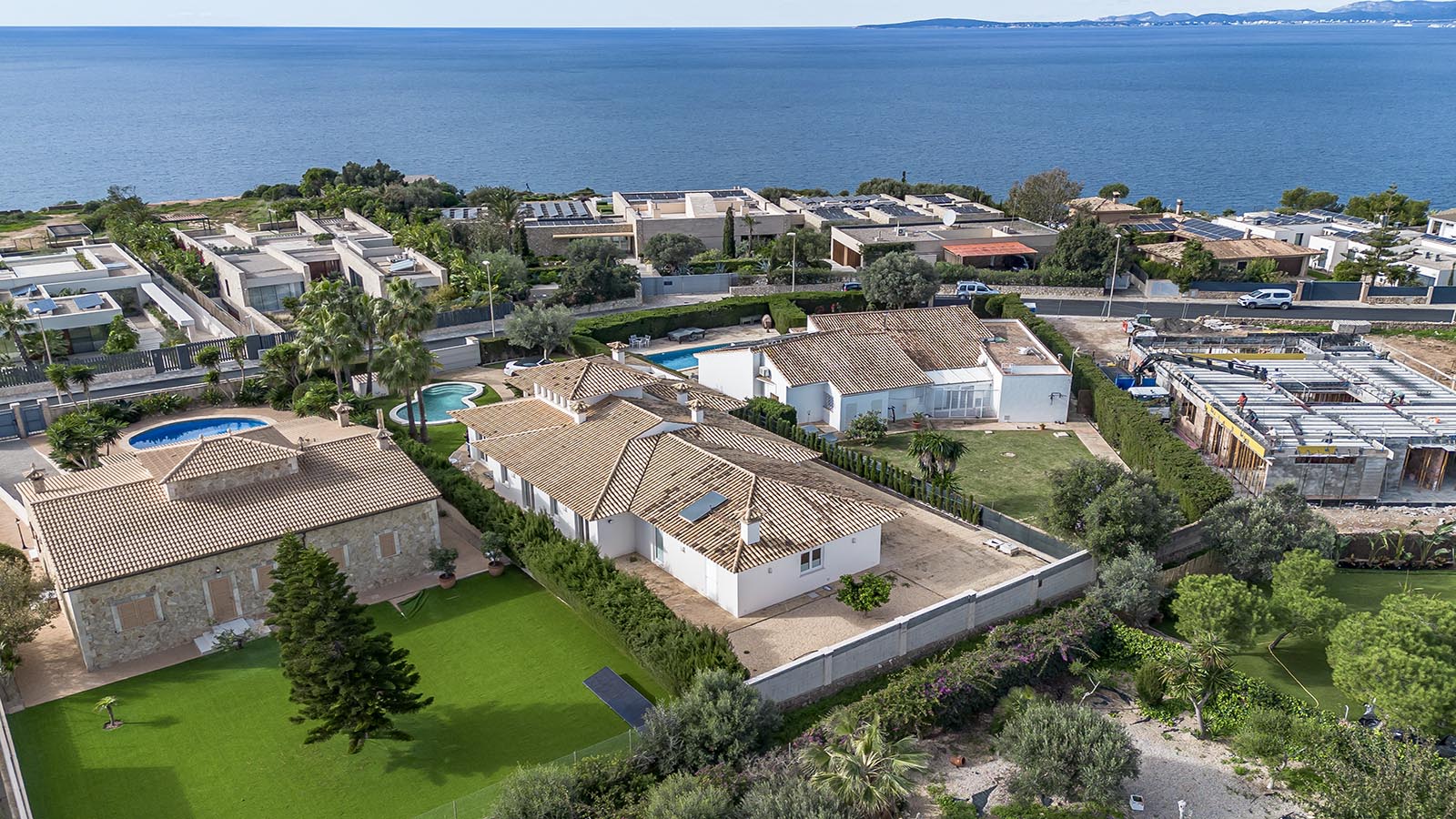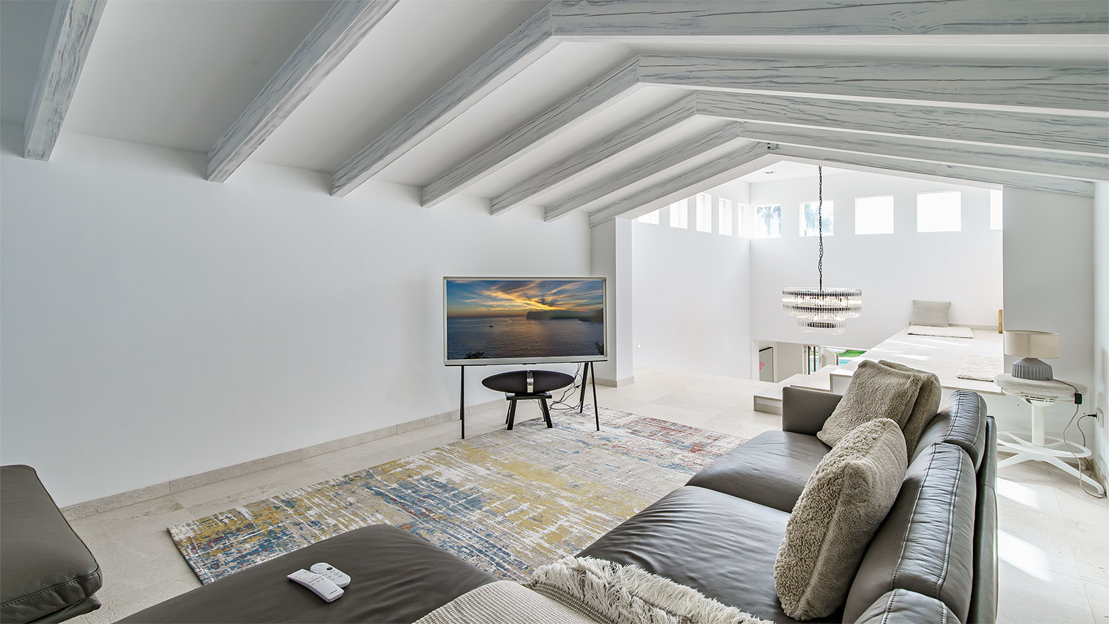 Technically, the villa focuses on efficiency and autonomy: an air-source heat pump supplies the underfloor heating and hot water, complemented by individually controllable air-conditioning units. A private desalination system ensures excellent water quality. The high-capacity electrical system supports the installed wallbox and is prepared for photovoltaic integration. A smart home system controls key functions.