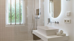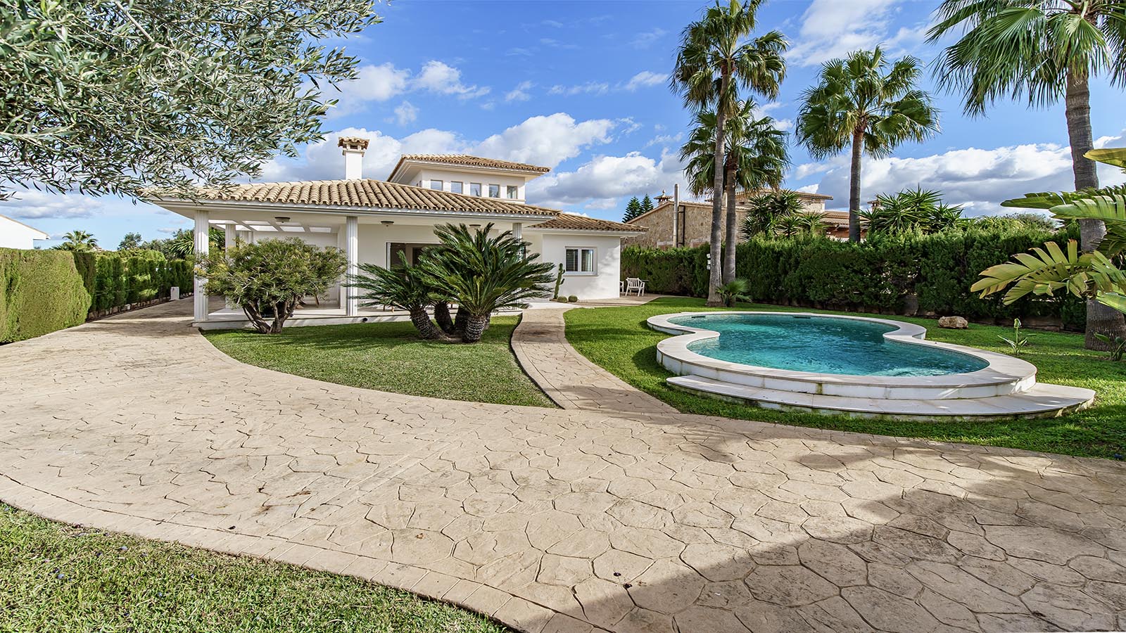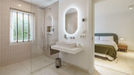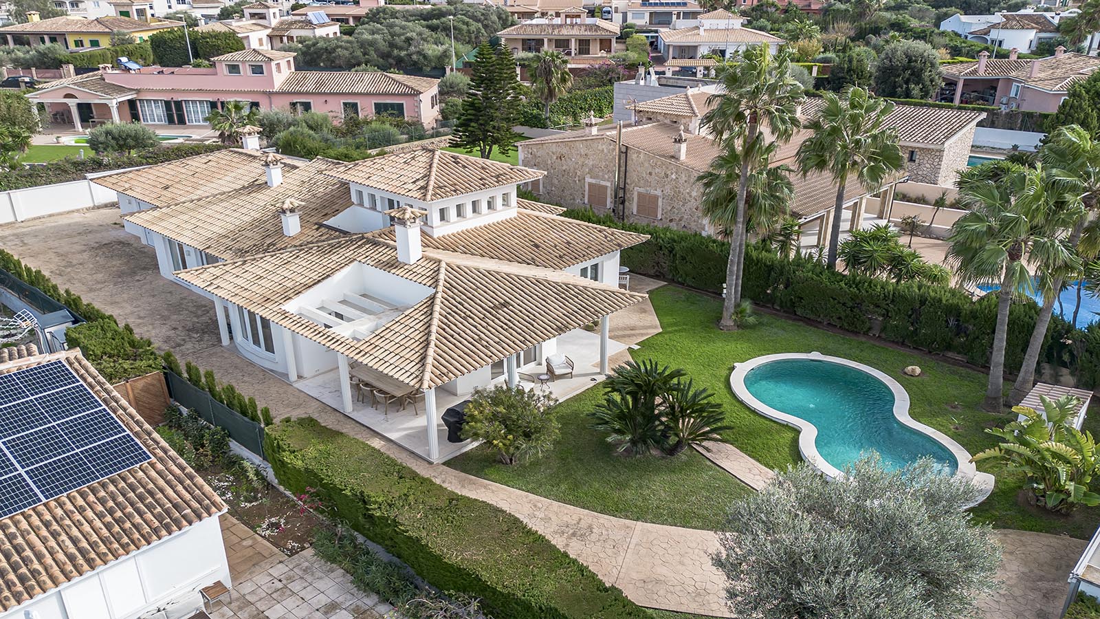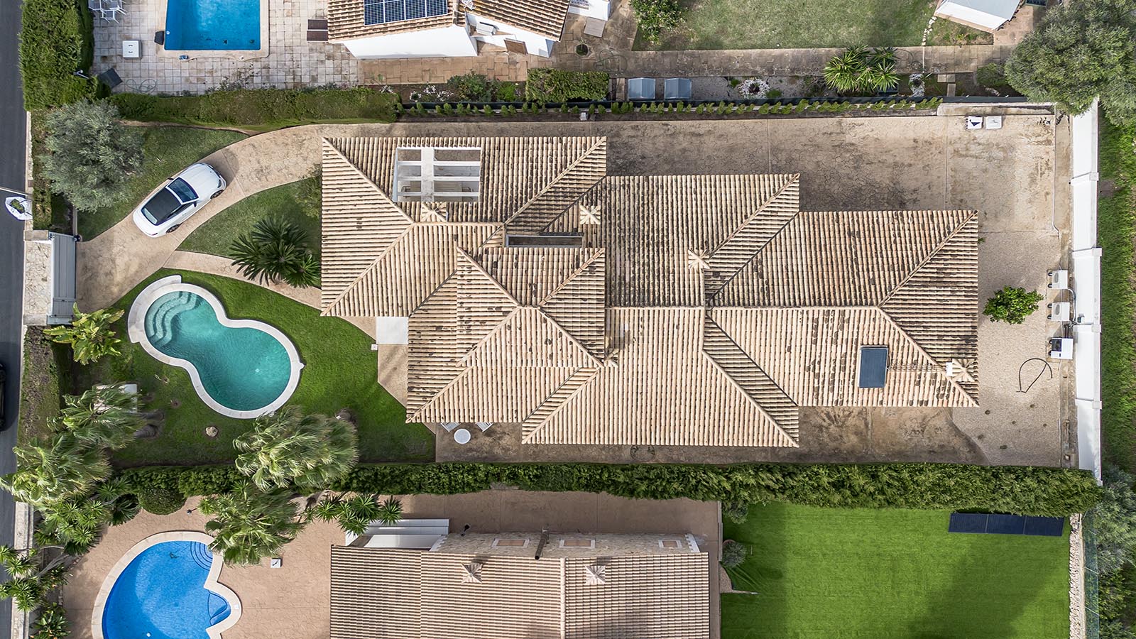 Technically, the villa focuses on efficiency and autonomy: an air-source heat pump supplies the underfloor heating and hot water, complemented by individually controllable air-conditioning units. A private desalination system ensures excellent water quality. The high-capacity electrical system supports the installed wallbox and is prepared for photovoltaic integration. A smart home system controls key functions.