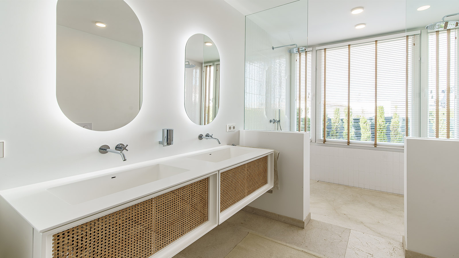 The barrier-free ground-floor layout impresses with exclusive materials: matte-sealed natural stone connects the living areas, while warm oak parquet flooring is used in the living room and master bedroom. The open kitchen features a cooking island with integrated downdraft ventilation, and the three contemporary bathrooms offer walk-in showers (the master bathroom includes a double shower) for maximum comfort. Sliding doors allow flexible room configurations.