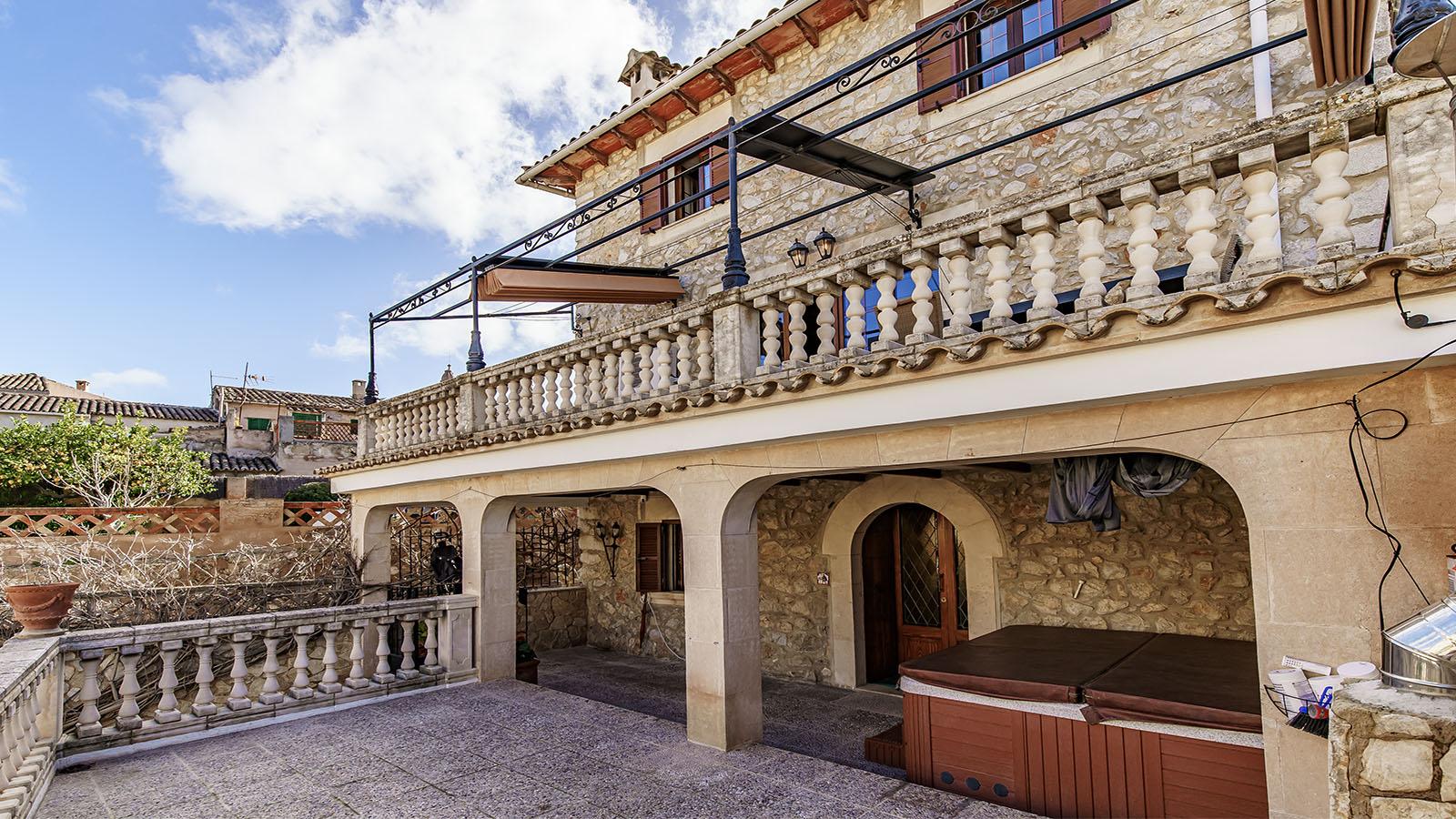 Authentic Mallorquin Townhouse in the Heart of Calvia Vila. Nestled in the heart of the highly sought-after village of Calvia Vila, on the prestigious southwest coast of Mallorca, this charming townhouse beautifully combines authentic character with modern comfort. The generous living space is distributed over 3 levels. On the entrance level, you will find a welcoming en-suite guest bedroom and a lovely terrace with a jacuzzi. The main level offers a bright and spacious open-plan living and dining area, seamlessly connected to a beautifully fitted kitchen. This floor also features a guest toilet and opens onto a delightful terrace with great mountain and village views. The upper floor comprises 3 further bedrooms, one being en-suite, and a separate bathroom. The property comes with a large garage with an EV charging station and a separate laundry room.