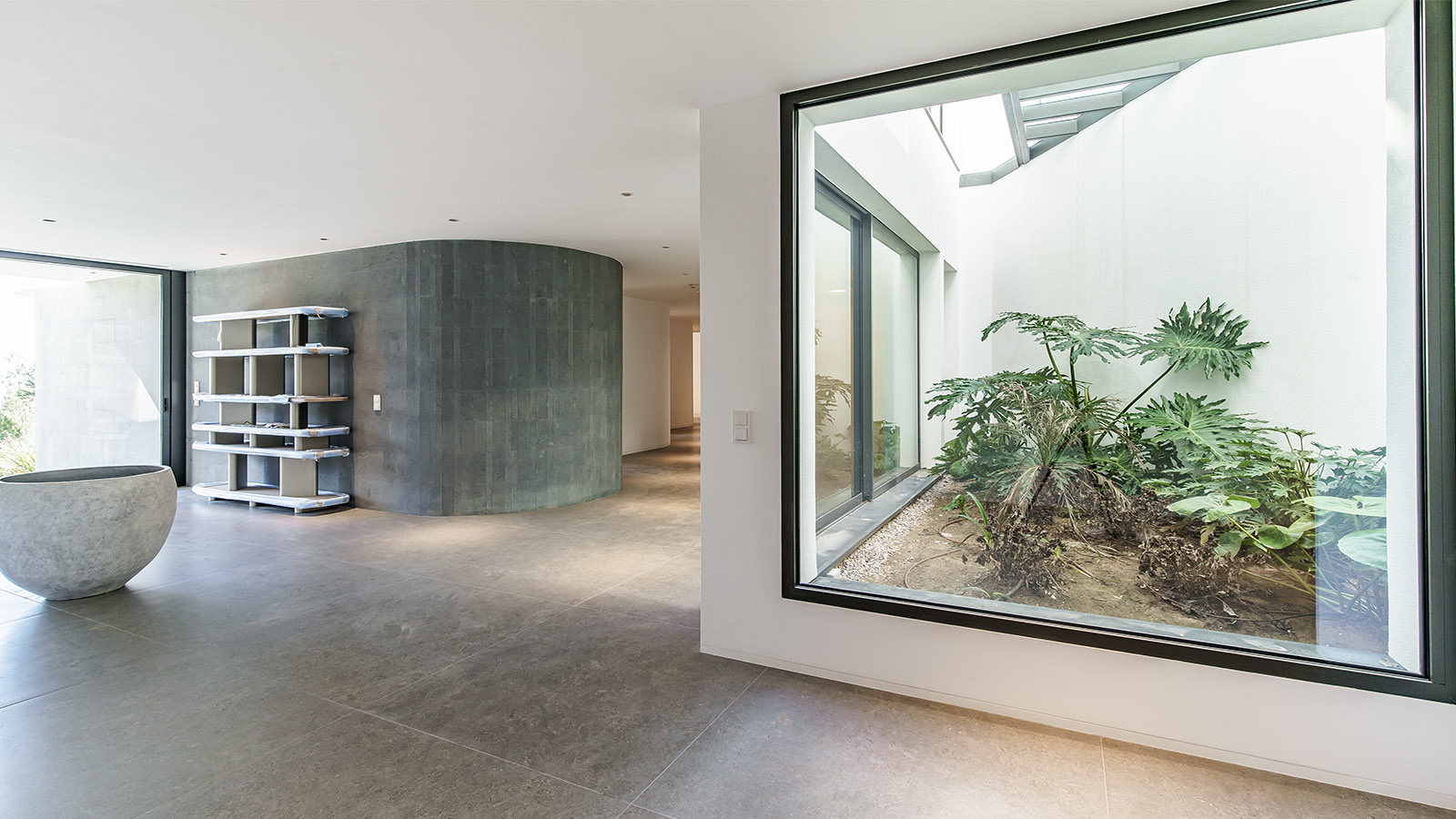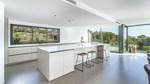 The light-filled living and dining area with an open-plan designer kitchen forms the heart of the home and flows seamlessly onto the spacious terraces, the elegant pool with chill-out area, and the beautifully landscaped garden.