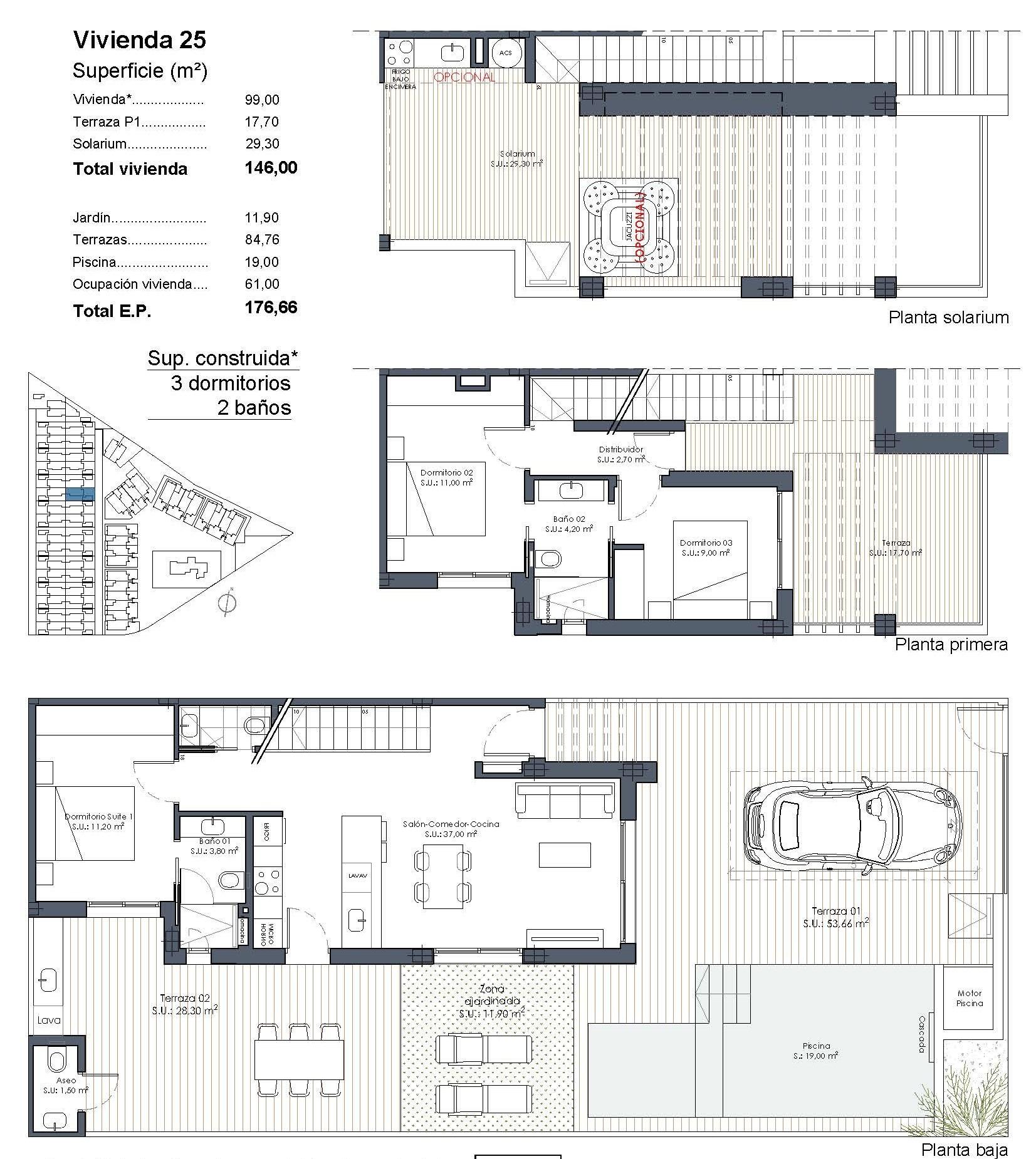 New Build Villas with Private Pool at Serena Golf-Los AlcazaresBoutique Collection of Modern Homes Near the SeaDiscover an exclusive boutique development of 37 modern quad and semidetached style villas located at La Serena Golf in Los Alcazares on the beautiful Costa Calida. These contemporary homes are designed for buyers seeking privacy, sunshine and an outdoor lifestyle just 300 meters from the warm waters of the Mar Menor.Los Alcazares is a charming coastal town known for its long promenade, sandy beaches and relaxed Mediterranean atmosphere. The area enjoys more than 300 days of sunshine per year and offers excellent restaurants, shops, marinas and sports facilities. Its location between the sea and the golf course makes it one of the most desirable destinations in the region for both permanent living and holiday homes.Modern Villas with Private Pool and Outdoor LivingEach property features a private plot with its own swimming pool, creating the perfect environment to enjoy the Mediterranean climate throughout the year. The homes include 3 bedrooms and 2 or 3 bathrooms plus guest toilets, offering comfortable and functional living spaces ideal for families or guests.The villas are designed to emphasize outdoor living. Next to the pool there is a barbecue area and an exterior guest toilet, perfect for entertaining friends and family. The rooftop solarium offers additional space to relax in the sun and includes a solar shower with pre installation for a jacuzzi and summer kitchen.Parking is included both within the private plot and with an assigned underground parking space.High Quality Finishes and Modern FeaturesThe homes are built with modern materials and quality specifications designed for comfort and style.Fully equipped kitchen with appliances in white glass finishBathrooms with backlit mirrors, shower screens and vanity unitsMotorized window shuttersBasic lighting packageFully installed ducted air conditioningThese features ensure a comfortable living experience whether the property is used as a main residence or holiday home.Resort Style Amenities and Excellent LocationOwners also enjoy access to shared resort style facilities with a neighboring development. These amenities include landscaped gardens, a lagoon style communal pool, spa area, gym and sauna.The location offers easy access to beaches, golf courses and nearby cities.Mar Menor beach 0.3 kmLa Serena Golf next to the developmentLos Alcazares town center 2 kmCartagena 22 kmMurcia 40 kmRegion de Murcia International Airport 30 kmAlicante Elche Airport 90 kmThe shallow waters of the Mar Menor are perfect for swimming, sailing, paddle surfing and other water sports all year round.Secure Your Mediterranean Lifestyle in Los AlcazaresThese new build villas offer the perfect combination of beach, golf and modern comfort on the Costa Calida. Contact us today to receive more information or arrange a visit and secure your new home at Serena Golf in Los Alcazares.