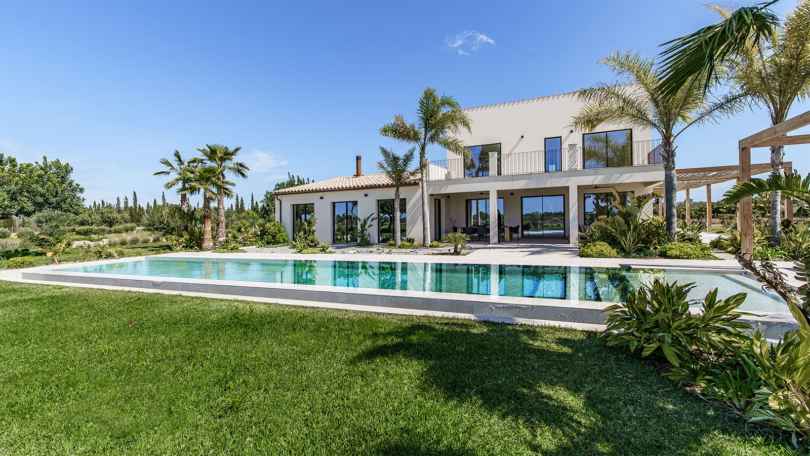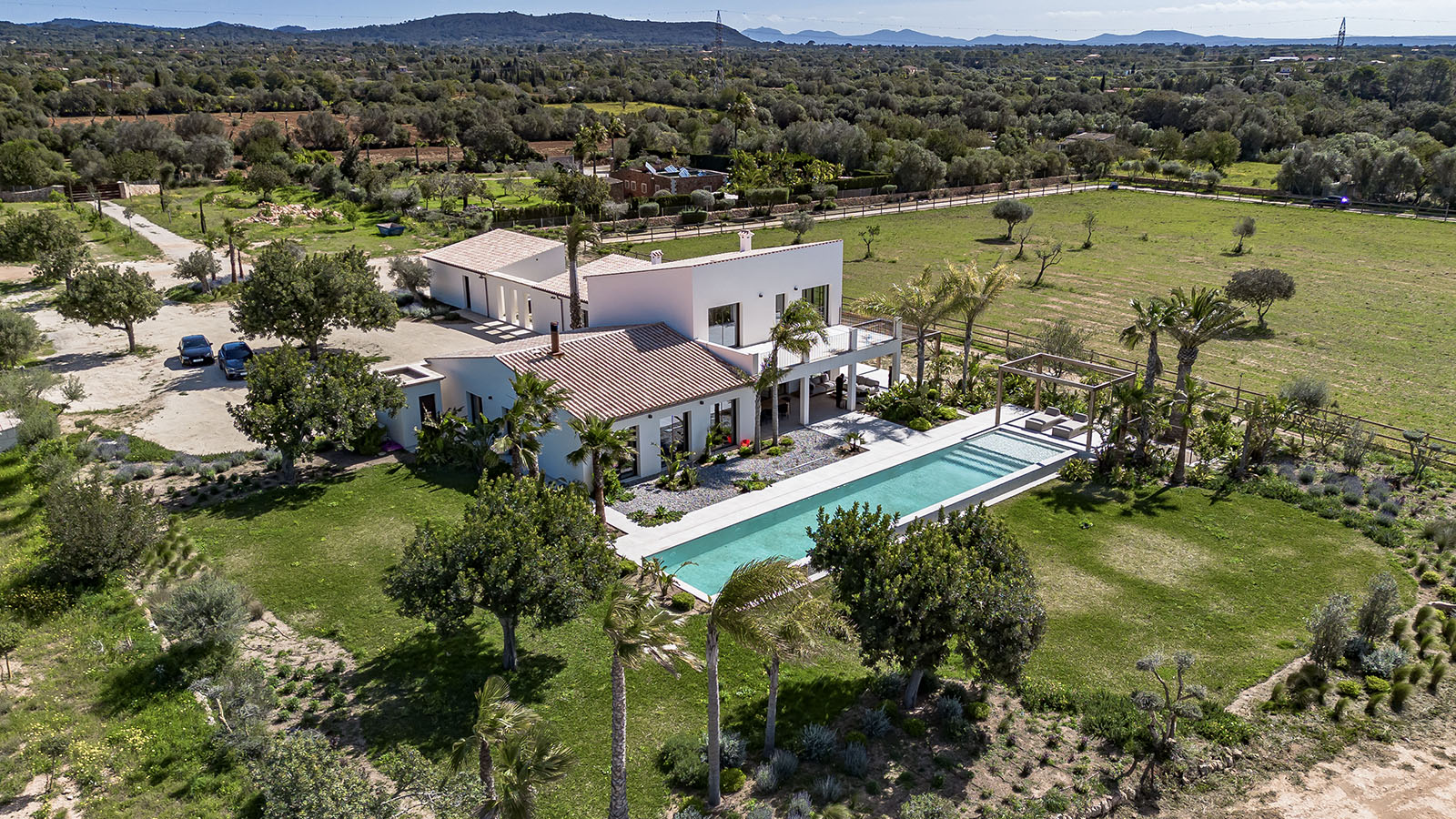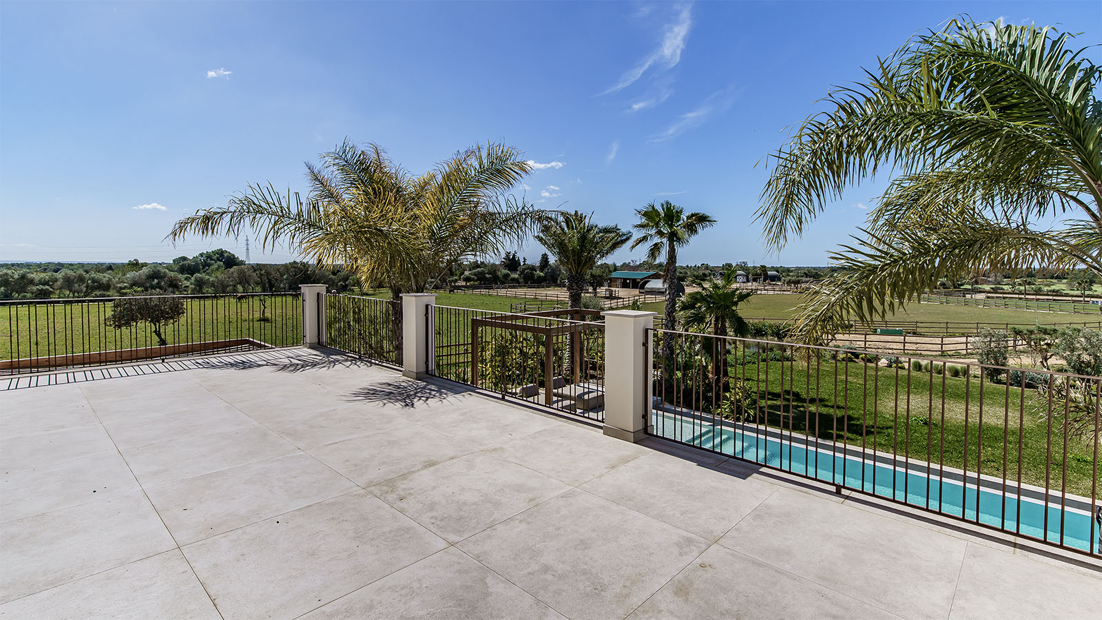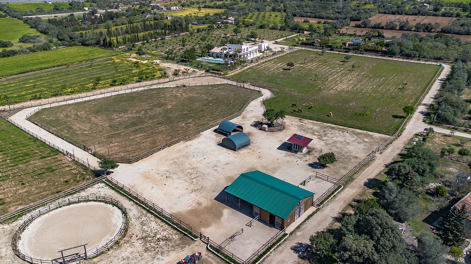 Great property with horse facilities for sale in Llucmajor, on the south coast of Mallorca. The spacious house is spread over 2 floors as follows: The 1st floor as a bright entrance hall leading to a spacious living and dining area, fully equipped kitchen, and utility room. This level also includes 2 bedrooms, one bathroom, a guest WC, and a separate office. From here, there is direct access to the covered terrace, pool area with lounge space, and a beautifully landscaped garden. The upper floor has a private master suite featuring an en suite bathroom and its own terrace.